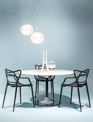 Une famille complète de lampes dont la particularité réside dans la forme du diffuseur, légèrement ovoïdal et transparent avec une surface à facettes à l’intérieur comme à l’extérieur, qui crée un jeu intense de reflets. Tokujin Yoshioka réussi à harmoniser la transparence et la lumière, grâce à un jeu de suggestions créatives des surfaces.