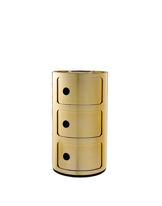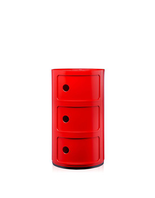 Ces éléments modulables ont été conçus afin de répondre à diverses exigences d'utilisation et pour trouver place dans toutes les pièces de la maison : dans la salle-de-bains, la chambre à coucher, la cuisine ou le séjour. L’idée maîtresse à la base du système est la superposition, élémentaire mais solide, des différents éléments qui composent de très pratiques meubles de rangement. Ronds ou carrés, certains éléments peuvent être équipés de roulettes. Flexibles, fonctionnels, pratiques, les Componibili ont reçu de multiples récompenses pour la valeur et l'innovation du projet (ils sont exposés au Musée d'art moderne de New York et au Centre Pompidou à Paris).Grâce à Kartell, le plastique est devenu précieux, noble et raffiné. Aujourd’hui, avec les nouvelles finitions brillantes et métallisées dans les tons or, cuivre, argent, le produit Kartell devient un véritable objet de luxe. En 2017 Kartell fête les 50 ans des Componobili, un des objets emblématiques de la marque et best absolu depuis 1967, ou il a fait son entrée au Salon du meuble de Milan. Pour célébrer cet anniversaire important, trois nouvelles couleurs sont disponnibles ainsi qu'une version à quatre éléments complétant ainsi l'offres des modèles en diamètre 32cm.