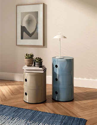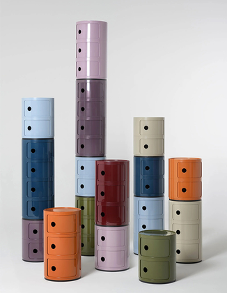 Les éléments Componibili ont été conçus afin de répondre à diverses exigences d'utilisation et pour trouver place dans toutes les pièces de la maison. Créés en 1967, les Componibili sont un classique intemporel du mobilier proposés, aujourd'hui, sous une forme ronde d'un diamètre de 32 cm. Fonctionnels et pratiques, ils trouveront leur place dans tous les espaces grâce à leurs compositions fixes comprenant deux, trois et quatre éléments. Ce modèle est décliné dans six finitions scintillantes et une finition argent mat.